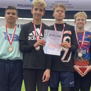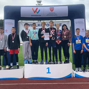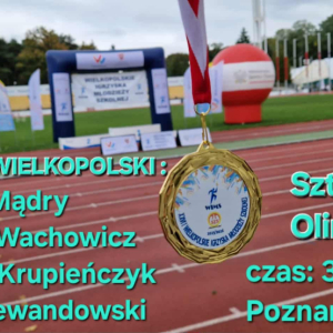 Do Poznania na finał wojewódzki w "Festiwalu Sztafet", zjechały się po dwa najszybsze zespoły z poszczególnych rejonów Wielkopolski, w wyznaczonej klasyfikacji wiekowej. Rozegrano pięć rodzajów biegów sztafetowych: 4x100m, 4x400m, 4x200m MIX, sztafety szwedzkie i olimpijskie. Naszą szkołę reprezentowały dwie drużyny, dziewczęca i chłopięca, obie w sztafecie olimpijskiej. Zespół męski okazał się najlepszy i zdeklasował inne drużyny, zdecydowanie wygrywając oraz osiągając rezultat poniżej 4min. To nowy REWELACYJNY rekord naszej szkoły, który teraz wynosi 3:55'28". WIELKIE BRAWA i GRATULACJE!! Chłopacy w składzie: Wiktor Mądry (100m), Oliwer Wachowicz (200m), Mikołaj Krupieńczyk (400m) i Adam Lewandowski (800m) spisali się NIESAMOWICIE. Rezerwowym był Patryk Pertkiewicz, który również dołożył ogromną cegiełkę do tego sukcesu, biorąc udział we wcześniejszych biegach na szczeblach: powiatowym i rejonowym, uzyskując awansy regulaminowe. Zespół dziewcząt w składzie: Oliwia Kopij (100m), Dominika Maćkowiak (200m), Blanka Jarczewska (400m), Julia Guryl (800m) i rezerwowa Lena Jankowiak, uplasował się na wysokim 10 miejscu.