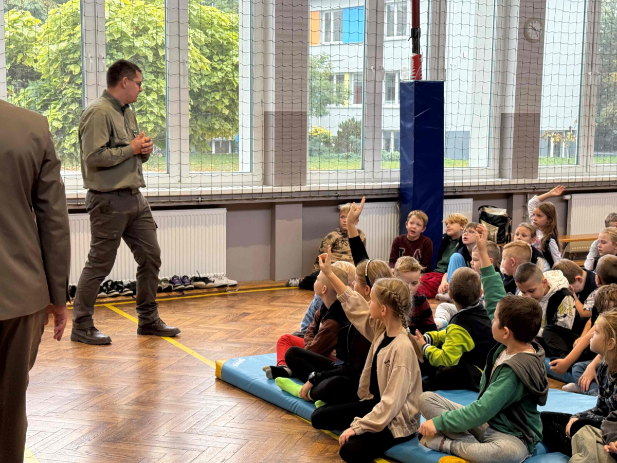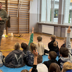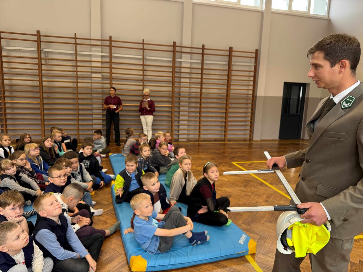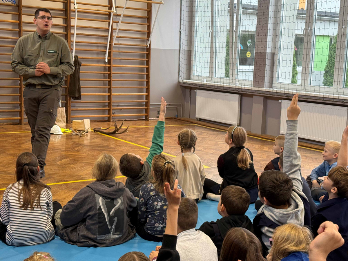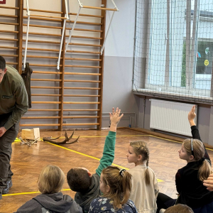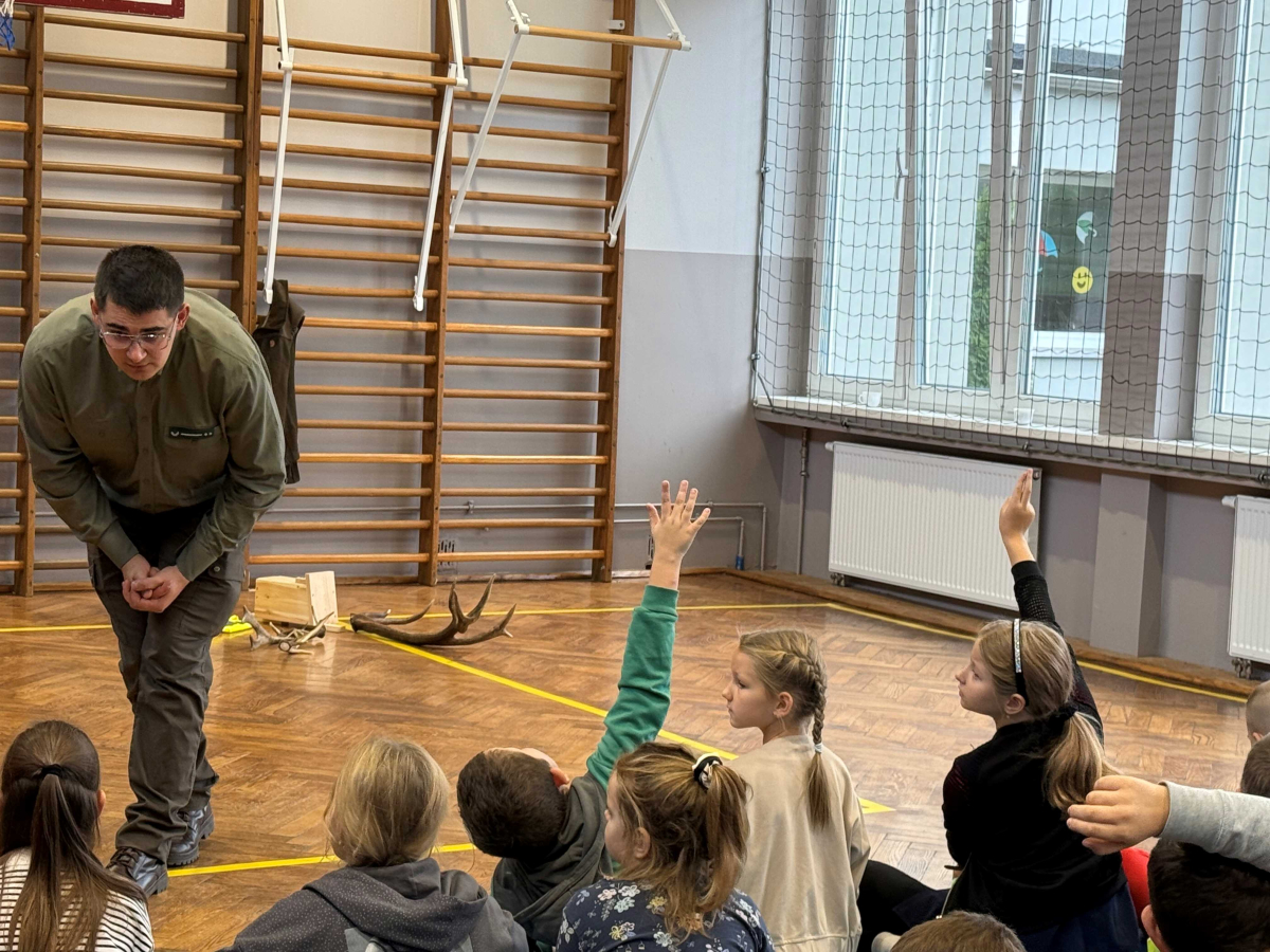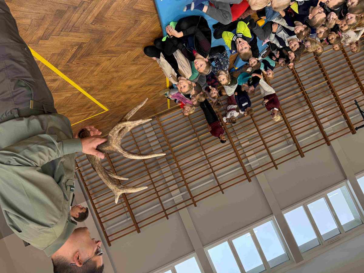 Dnia 15 października br. w naszej szkole odbyło się spotkanie z panami leśniczymi – panem Szymonem Kubasem oraz panem Hubertem Węcłasiem. Goście przybliżyli uczniom klas I–III fascynujący świat lasu, jego mieszkańców oraz znaczenie ochrony przyrody. Podczas zajęć uczniowie dowiedzieli się, jak wygląda praca leśnika na co dzień, jakie zwierzęta można spotkać w naszych lasach i jak rozpoznawać poszczególne gatunki drzew. Dzieci z wielkim zainteresowaniem słuchały opowieści o życiu lasu, a także zadawały mnóstwo pytań – od tych o dzikie zwierzęta, po ciekawostki o sadzeniu drzew. Nie zabrakło również praktycznych wskazówek, jak zachowywać się w lesie, by chronić jego mieszkańców i cieszyć się pięknem natury w sposób odpowiedzialny. Spotkanie z leśnikami było nie tylko źródłem wiedzy, ale także inspiracją do dalszego poznawania przyrody. Uczniowie opuścili salę gimnastyczną z uśmiechami na twarzach i nową dawką ekologicznej świadomości.Dziękujemy naszym gościom za poświęcony czas, pasję i zaangażowanie w edukację młodych miłośników przyrody!