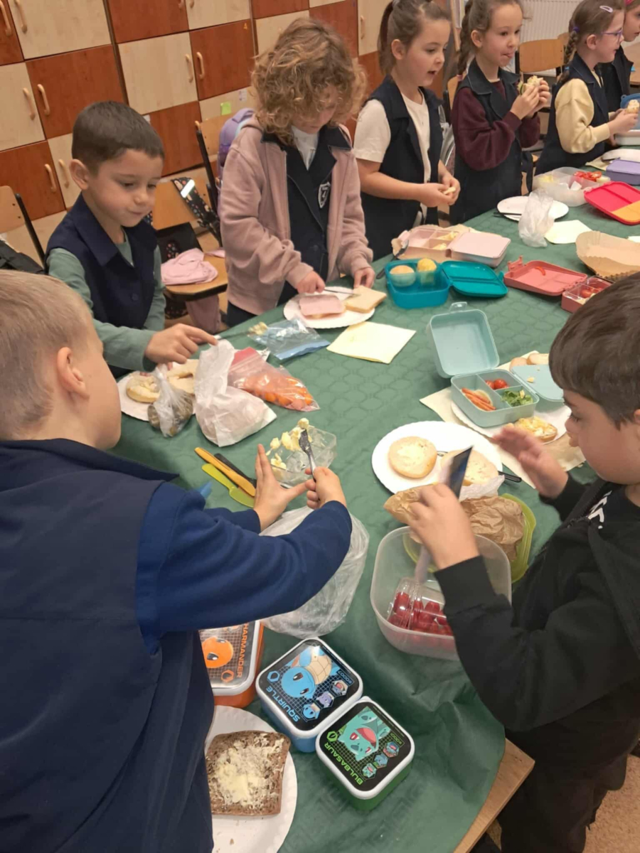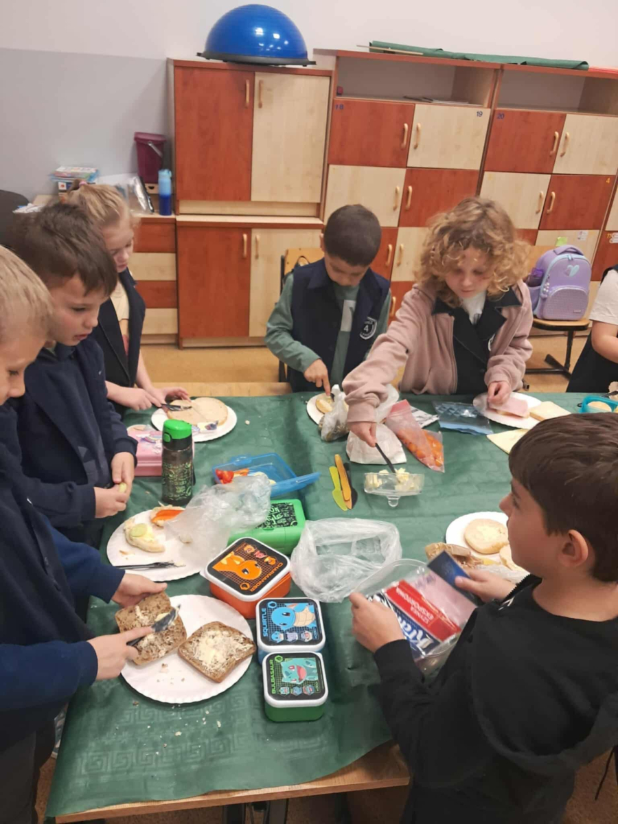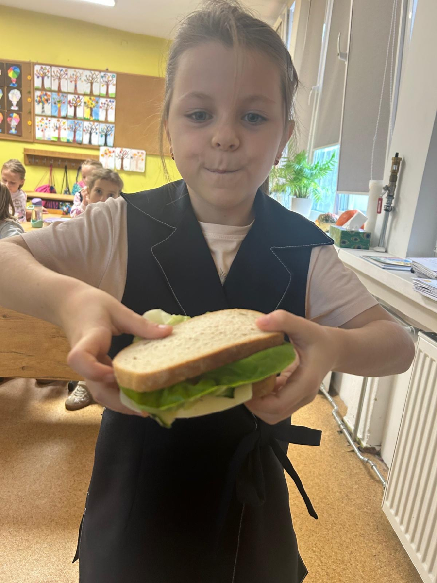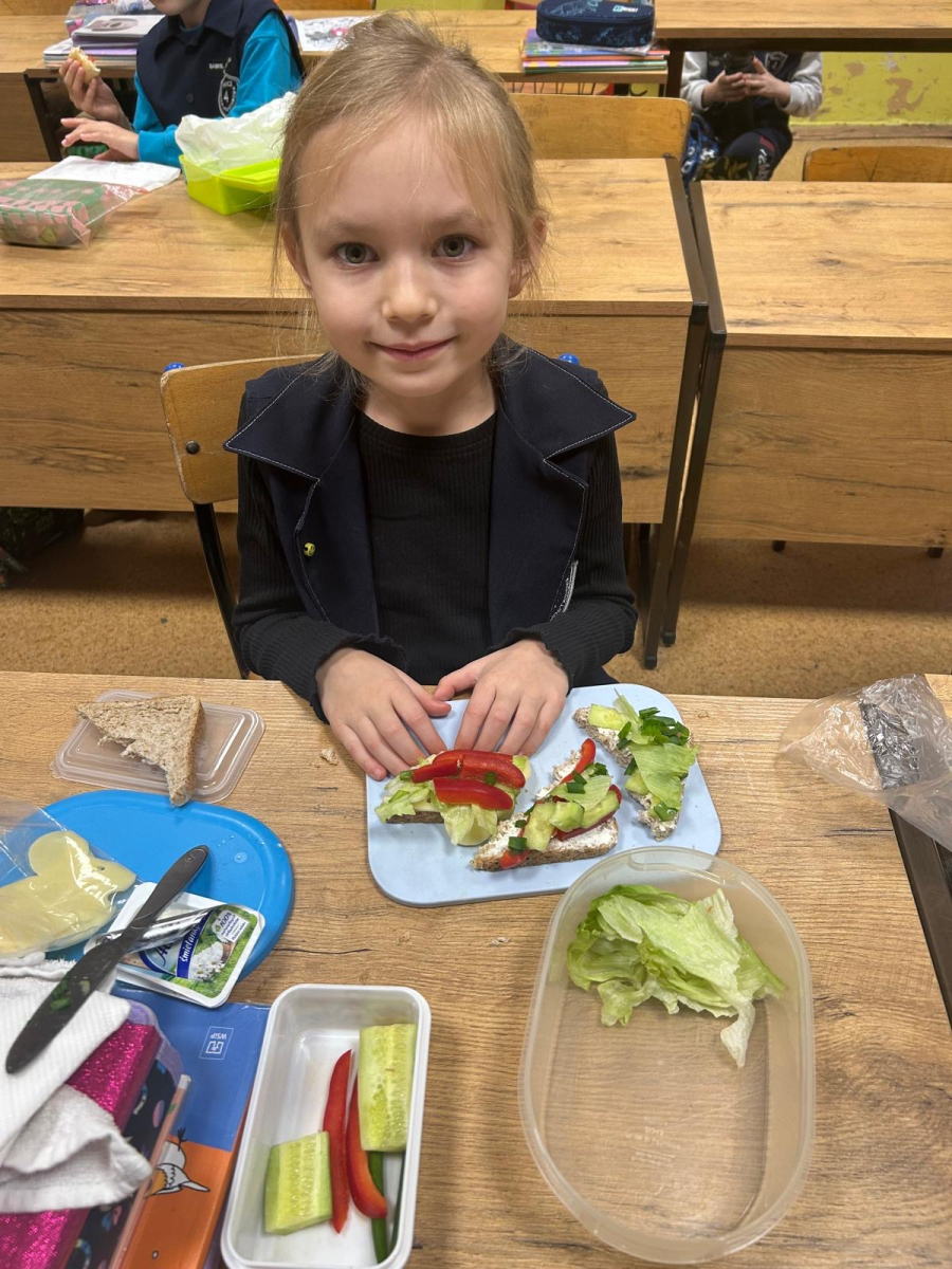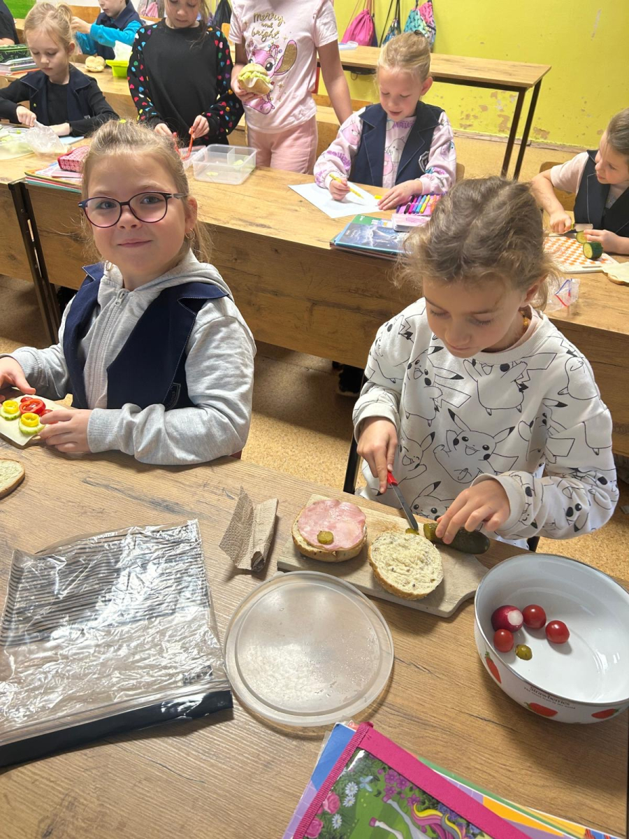 Na stołach pojawiły się świeże warzywa, pełnoziarniste pieczywo, sery, wędliny, a także wiele zdrowych dodatków. Dzieci z zaangażowaniem komponowały własne kanapki, dbając o to, aby były nie tylko smaczne, ale też pełne witamin i kolorów. Nie zabrakło pomysłowości – powstały prawdziwe kulinarne dzieła sztuki!