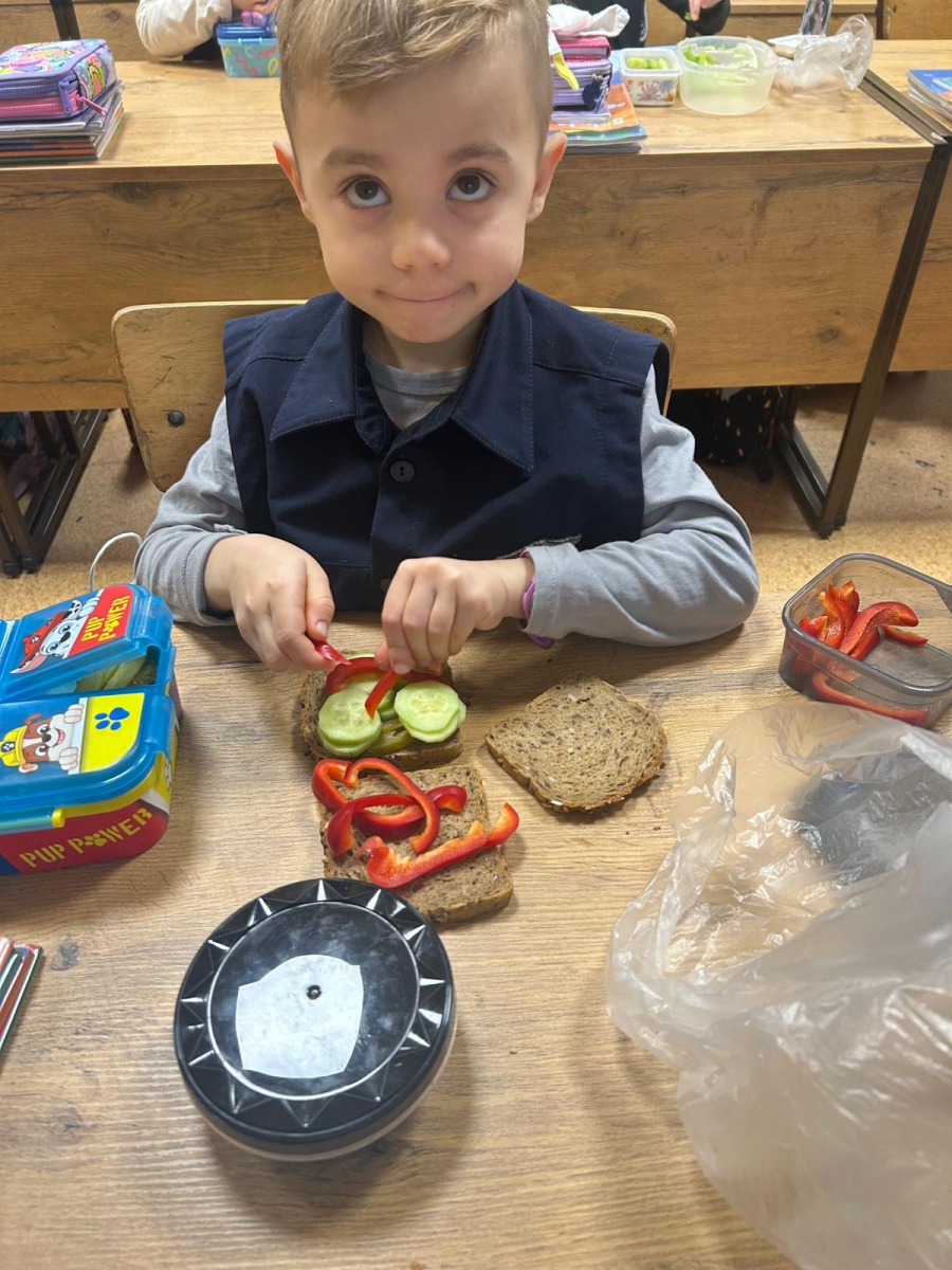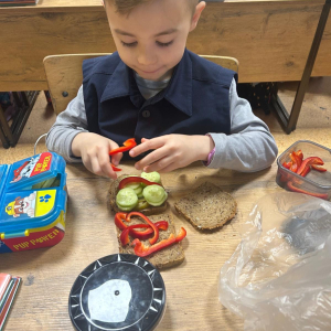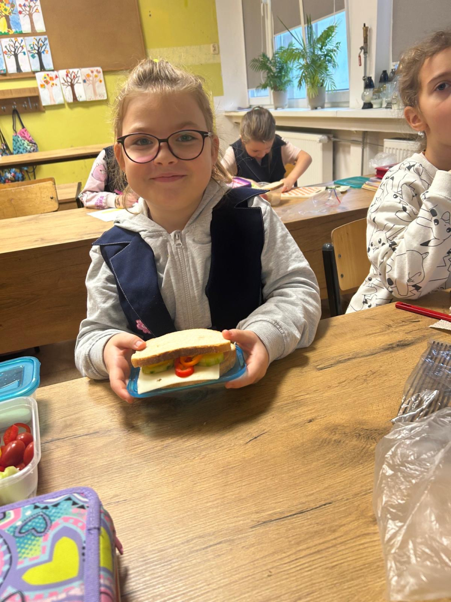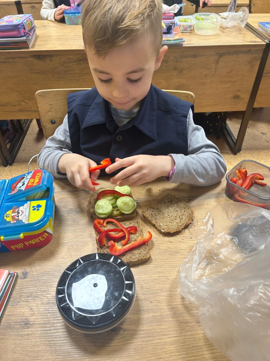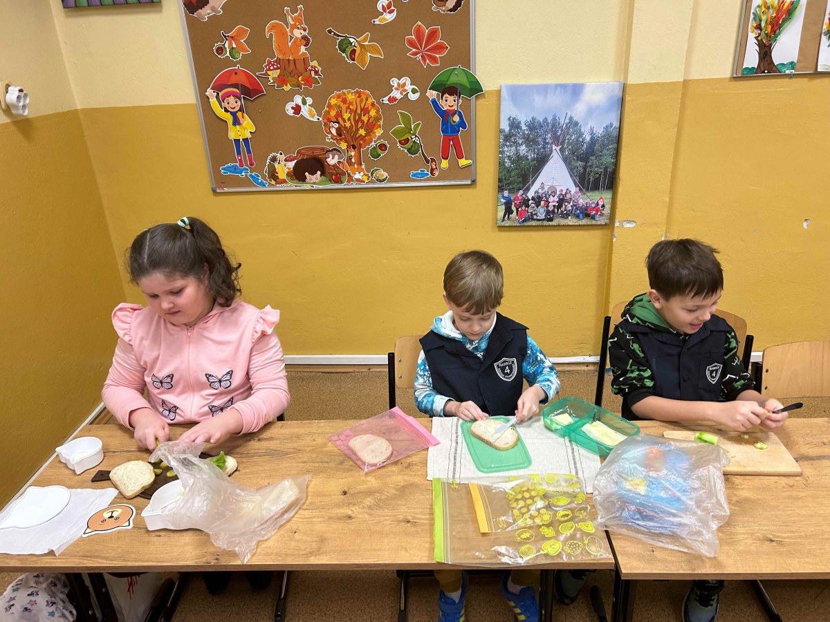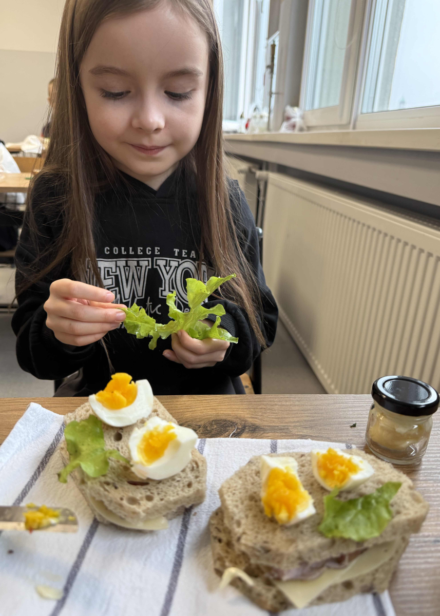 Na stołach pojawiły się świeże warzywa, pełnoziarniste pieczywo, sery, wędliny, a także wiele zdrowych dodatków. Dzieci z zaangażowaniem komponowały własne kanapki, dbając o to, aby były nie tylko smaczne, ale też pełne witamin i kolorów. Nie zabrakło pomysłowości – powstały prawdziwe kulinarne dzieła sztuki!