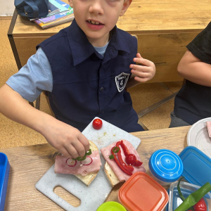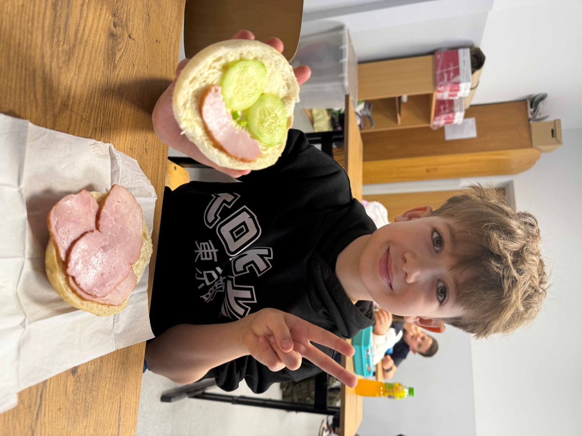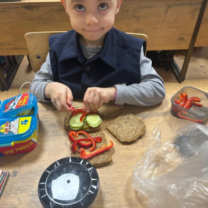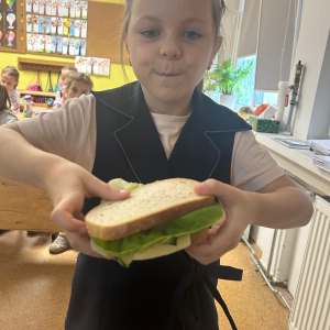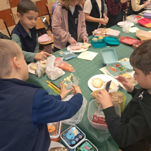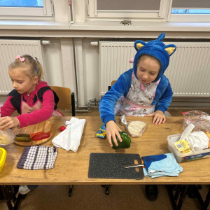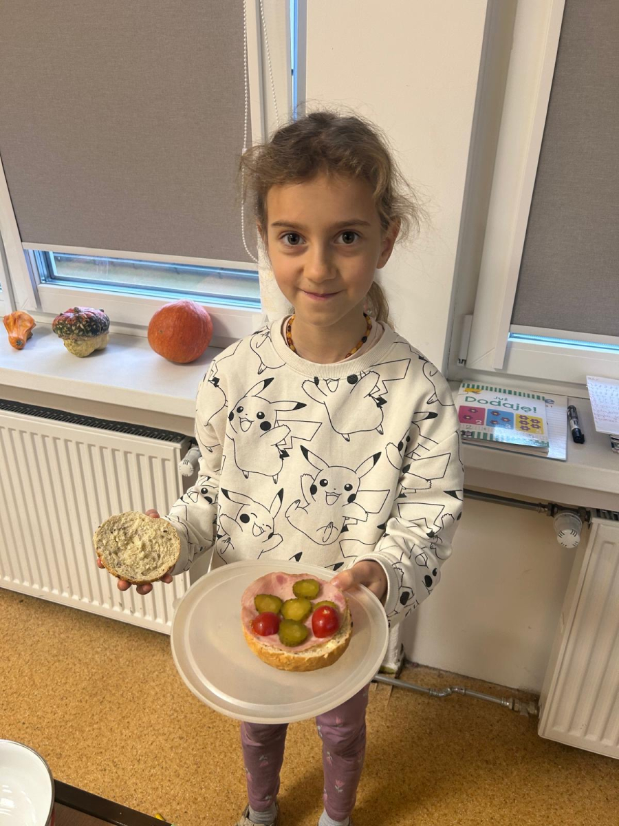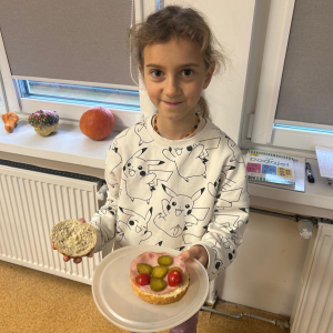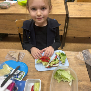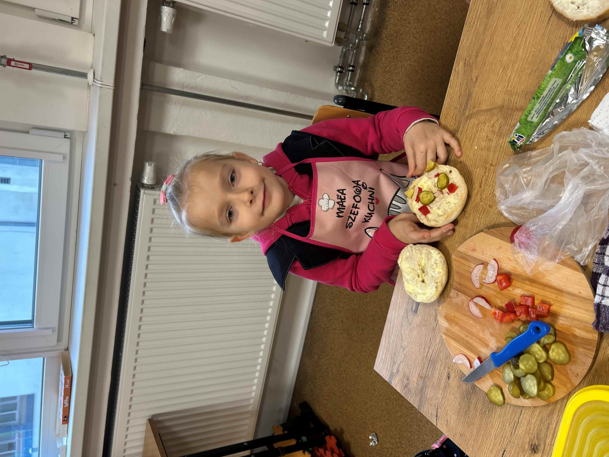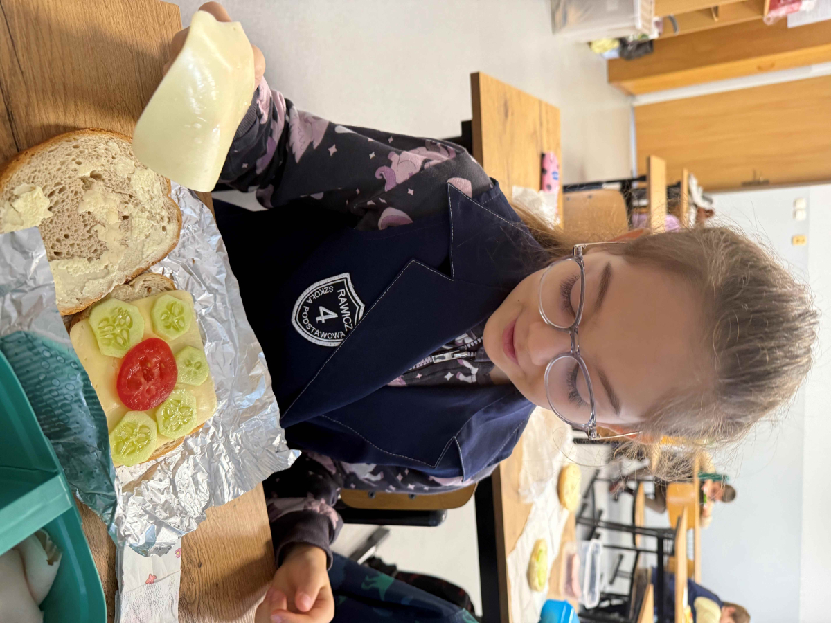 Na stołach pojawiły się świeże warzywa, pełnoziarniste pieczywo, sery, wędliny, a także wiele zdrowych dodatków. Dzieci z zaangażowaniem komponowały własne kanapki, dbając o to, aby były nie tylko smaczne, ale też pełne witamin i kolorów. Nie zabrakło pomysłowości – powstały prawdziwe kulinarne dzieła sztuki!